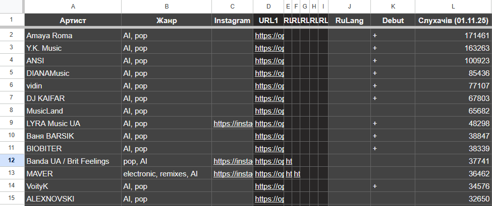 Усі вони дебютували цього року й позначені як AI, pop. У них немає акаунту в Instagram (окрім LYRA Music UA, 8 місце в топі, яка намагається імітувати присутність у соцмережах).