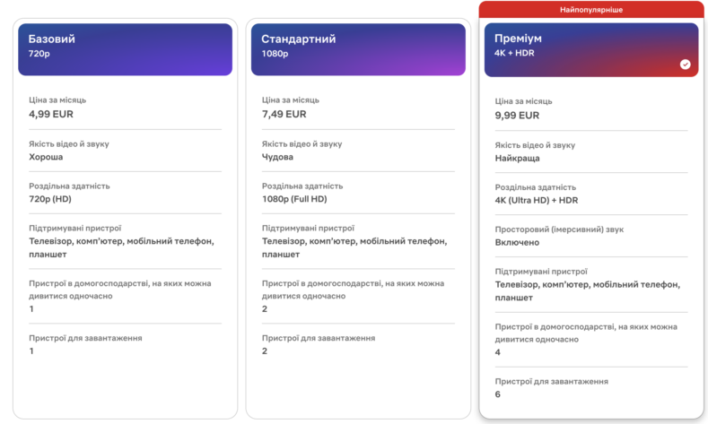 Найдешевший тариф із рекламою у США подорожчав із $7,99 до $8,99 на місяць. Стандартний план без реклами тепер коштує $19,99 замість $17,99, а преміумпідписка — $26,99 на місяць.