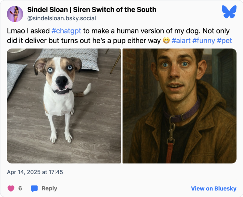 Потрібно завантажити зображення свого улюбленця до ChatGPT, а потім попросити його уявити вашу тваринку людиною. Можна додати додаткові підказки: вибір одягу, вираз обличчя, фонові зображення тощо.