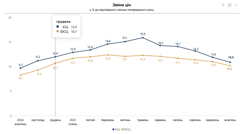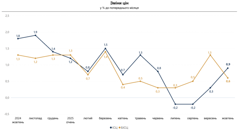 Держстат оприлюднив дані про інфляцію в Україні за жовтень 2025 року. За місяць споживчі ціни зросли на 0,9%, а у річному вимірі — на 10,9% порівняно з жовтнем 2024 року.