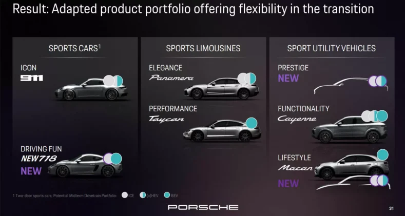 Також Porsche розробляє оновлену серію 718 із традиційними бензиновими двигунами, а флагманський позашляховик отримає гібридний варіант, відмовившись від повністю електричної версії. Починаючи з 2028 року, бренд обіцяє більш збалансовану пропозицію трансмісій для стабільного зростання.
