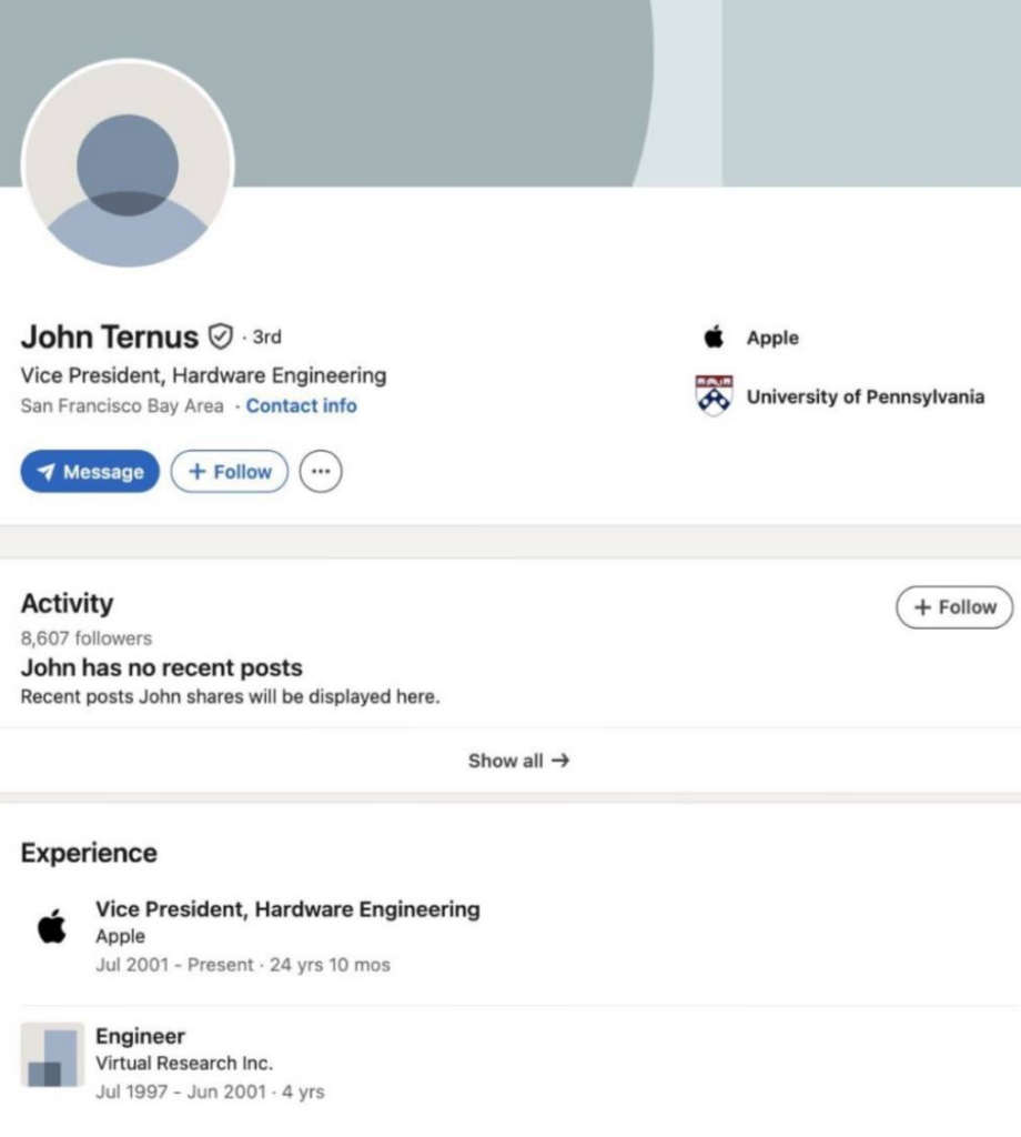 Біографія Тернаса — історія чистого продукту Apple. Крім чотирьох років у маловідомій Virtual Research Systems, він не працював ніде. У 1997-му закінчив Пенсільванський університет як інженер-механік. Його дипломний проєкт — механічна рука для людей з інвалідністю, що керується рухами голови. Тобто показовий інженер-практик, який сфокусований на розв’язанні конкретних hardware-проблем.