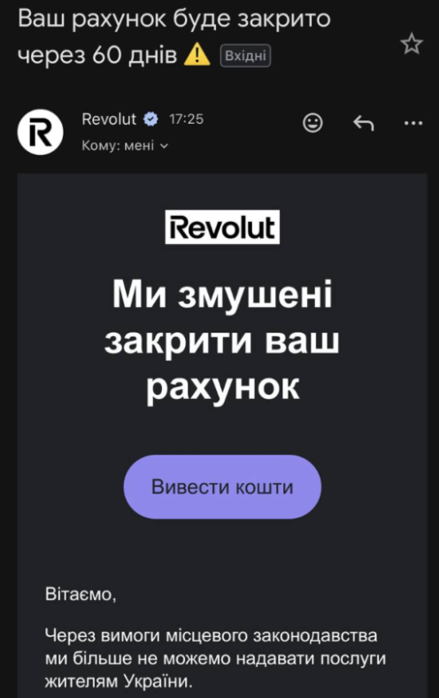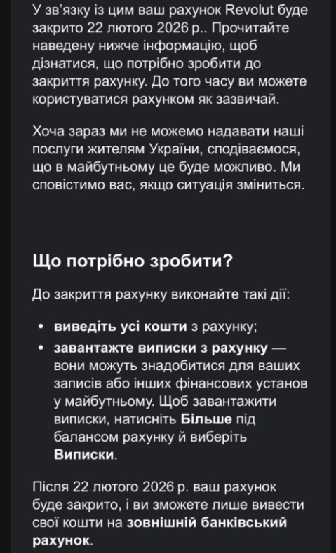 Revolut призупиняє надання послуг користувачам в Україні та починає закриття рахунків. Повідомлення про це українські клієнти почали отримувати 22 грудня.