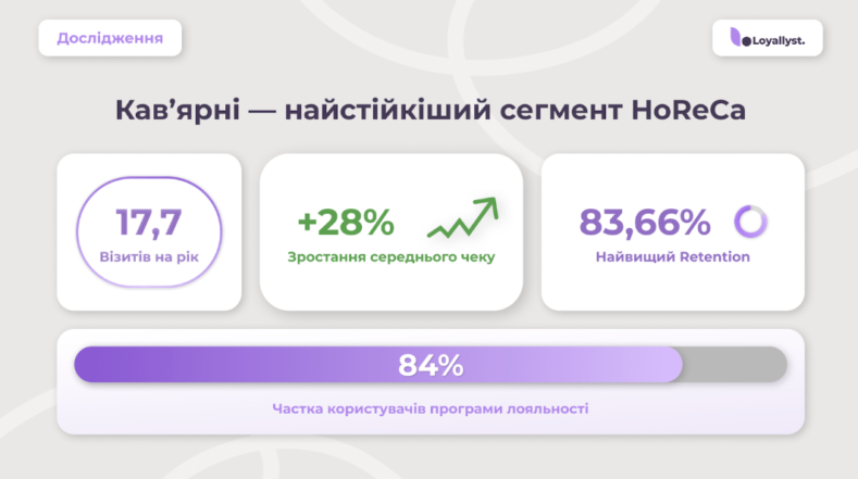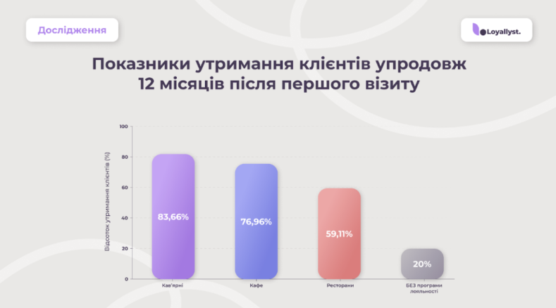 Дослідження показало, що найсильніший ефект програми лояльності видно у кав’ярнях. Тут рівень утримання клієнтів протягом року перевищує 83%. Бонус під час першого візиту підвищує ймовірність повторного приходу у 2,5-5 разів. Без такої мотивації кожен п’ятий гість не повертається.