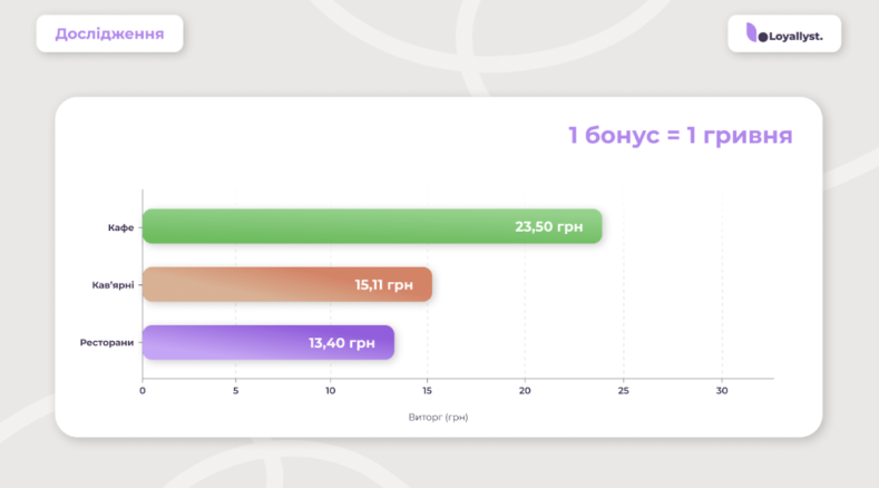 Кафе продемонстрували найвищу цінність клієнта — 4 476 грн і найкращу окупність бонусів. Середній чек активного учасника програми зріс із 160 до 260 грн. Тобто, навіть невеликий кешбек стимулює додаткові замовлення.