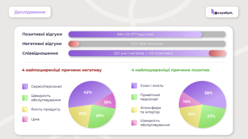 Дослідження також відобразило зміну поведінки гостей у 2025 році. Візити стали рідшими, але більш усвідомленими: клієнти обирають заклади, де мають накопичені бонуси або персональні пропозиції. Аналіз 28 000 відгуків показав, що 42% негативних оцінок стосуються сервісу й персоналу, 28% — швидкості обслуговування, і лише 20% — якості страв чи напоїв.