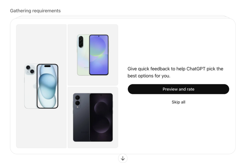 Інструмент дозволяє порівнювати характеристики, знаходити знижки, обирати подарунки та шукати схожі моделі. Під час вибору ChatGPT ставить уточнювальні запитання, щоб звузити параметри пошуку. Для користувачів тарифу Pulse доступна додаткова опція — автоматичні картки з персоналізованими рекомендаціями на основі попередніх розмов.