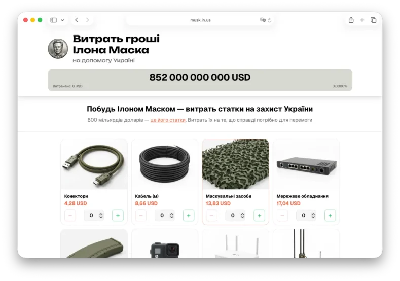 Українська Yankov Club запустила благодійну онлайн-гру, в якій пропонують витратити $852 млрд статків Ілона Маска на потреби України. Деталями команда поділилася з Vector. Розповідаємо деталі.