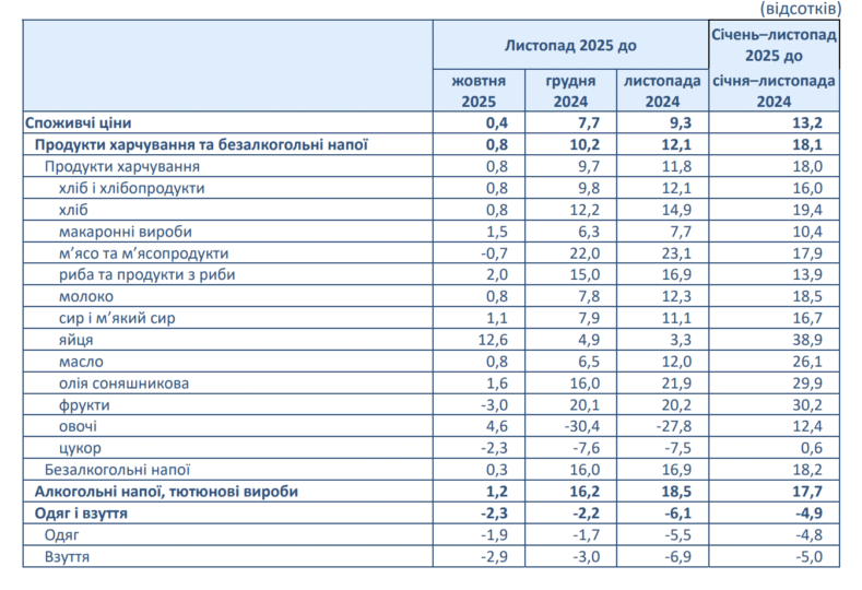 Державна служба статистики оприлюднила дані, згідно з якими річна інфляція у листопаді сповільнилася до 9,3%. Місячний приріст цін становив 0,4%. Базова інфляція зросла на 0,3% та залишилася на рівні 9,3% у порівнянні з листопадом 2024 року.