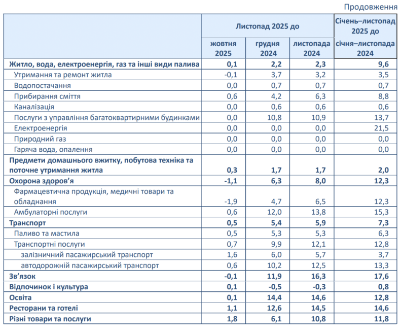 Житло, вода, електроенергія, газ та інші види палива, відпочинок і культура, освіта, ресторани та готелі подорожчали на 0,1%.