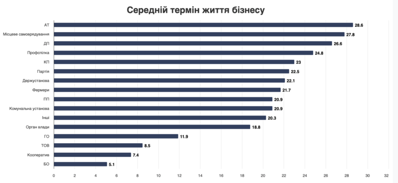 Середній термін життя компаній, які припинили роботу у 2025 році, значно відрізняється залежно від організаційно-правової форми та сфери діяльності.