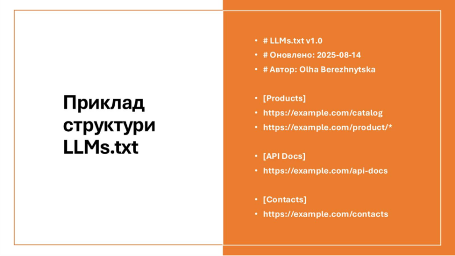 Крок другий — формування структури файлу. Це можна генерувати автоматично за допомогою розробника сайту. Зазвичай LLMs.txt створюється у форматі markdown або plain text. У ньому зазначаються: