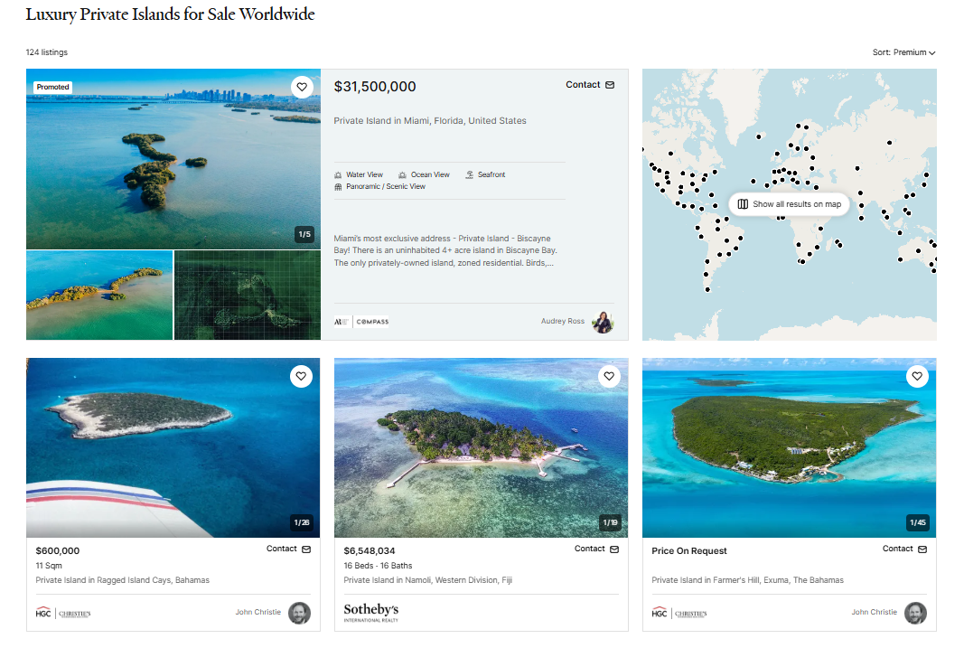 Нині у світі існує лише близько 2 000 островів, які розташовані достатньо близько до суші, у стабільних регіонах і дозволені для забудови. За даними міжнародного люксового онлайн-маркетплейса JamesEdition, наразі по всьому світу виставлено на продаж понад 120 приватних островів. Карибський регіон, зокрема Багами, разом зі США та Бразилією у світових лідерах.
