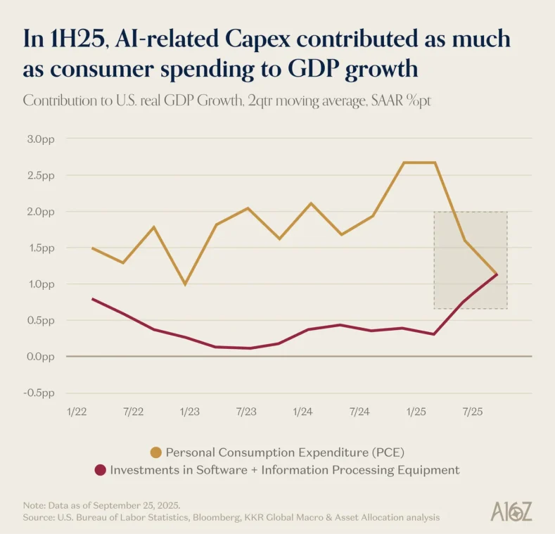 У першій половині 2025 року споживчі витрати та капітальні витрати на штучний інтелект зробили приблизно однаковий внесок у чисте зростання ВВП. Водночас їхня вага в економіці суттєво різниться: споживчі витрати й надалі формують близько 70% загального ВВП, тоді як інвестиції в ШІ залишаються значно меншою частиною бази.