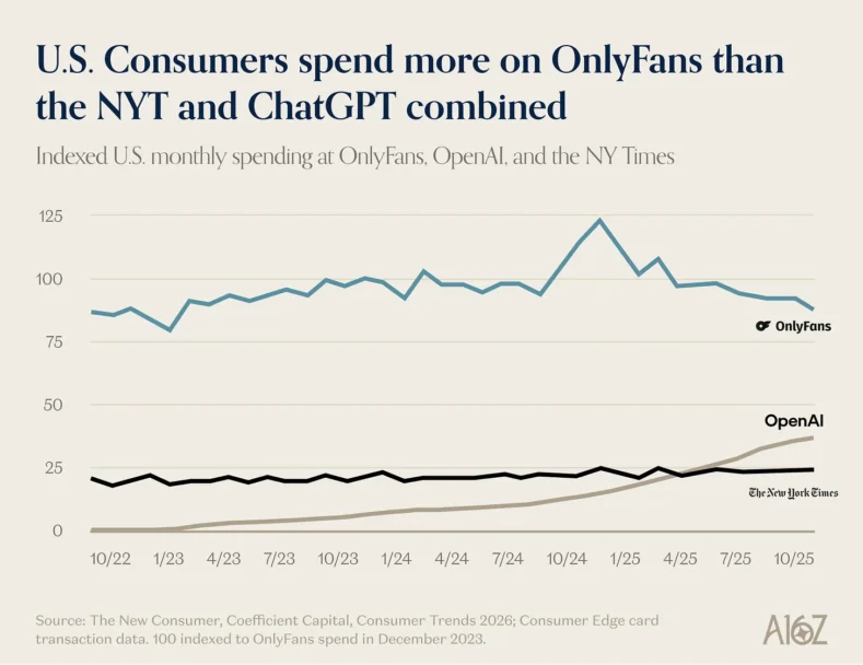 Згідно з транзакційною аналітикою Consumer Edge, витрати американських користувачів на OnlyFans перевищують сукупні витрати на OpenAI та The New York Times.