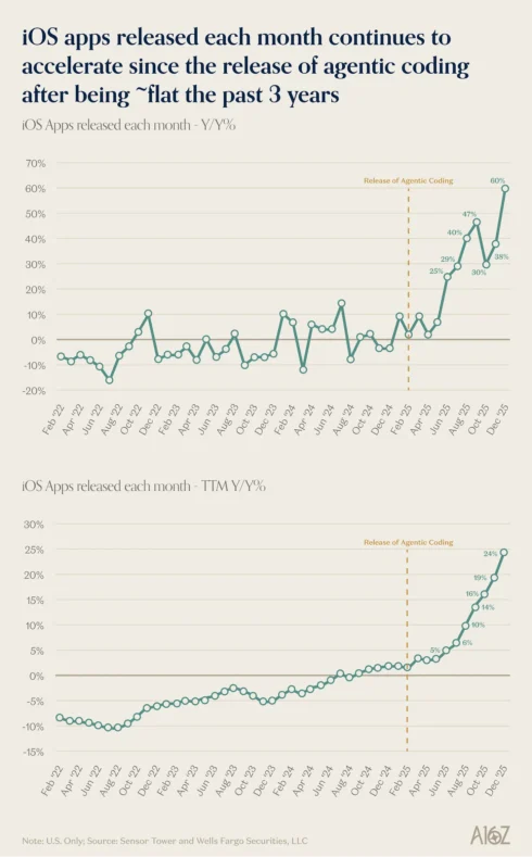Дані з App Store показують різке покращення екосистеми застосунків. Після майже нульового зростання протягом трьох років кількість нових iOS-застосунків у грудні зросла на 60% у річному вимірі. Аналітики пов’язують це з поширенням агентського кодування — використанням ШІ для швидкої розробки застосунків, що знижує поріг входу для індивідуальних розробників і малих команд.