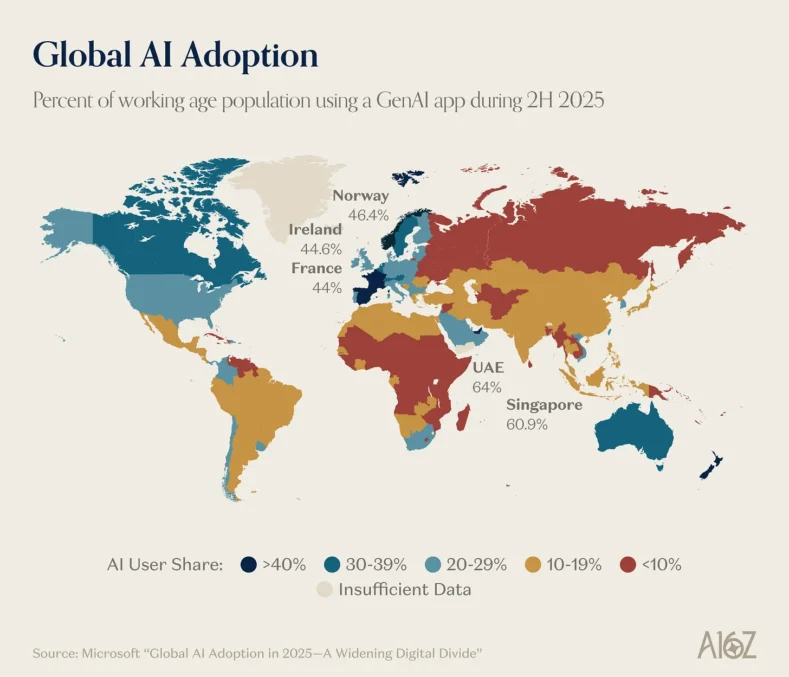Дослідження Microsoft показало нерівномірне глобальне впровадження генеративного ШІ. У другій половині 2025 року використання таких інструментів зростало майже вдвічі швидше в країнах Глобальної Півночі, ніж у Глобальному Півдні. Лідерами стали ОАЕ та Сінгапур, де ШІ використовували близько 64% працездатного населення. США, попри зростання використання, опустилися в рейтингу через швидший прогрес інших країн. Дослідники зазначають, що цей розрив може мати довгострокові наслідки та посилювати різницю в продуктивності чи економічних можливостях між регіонами.