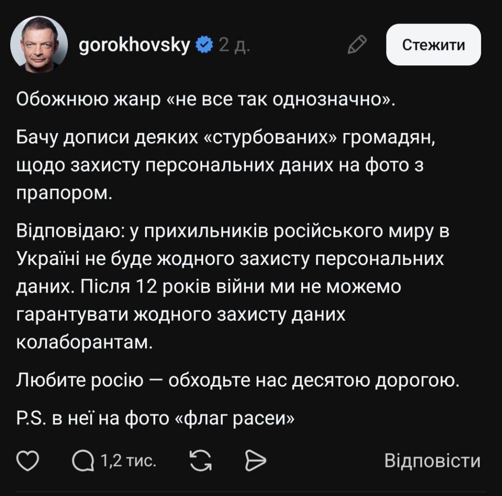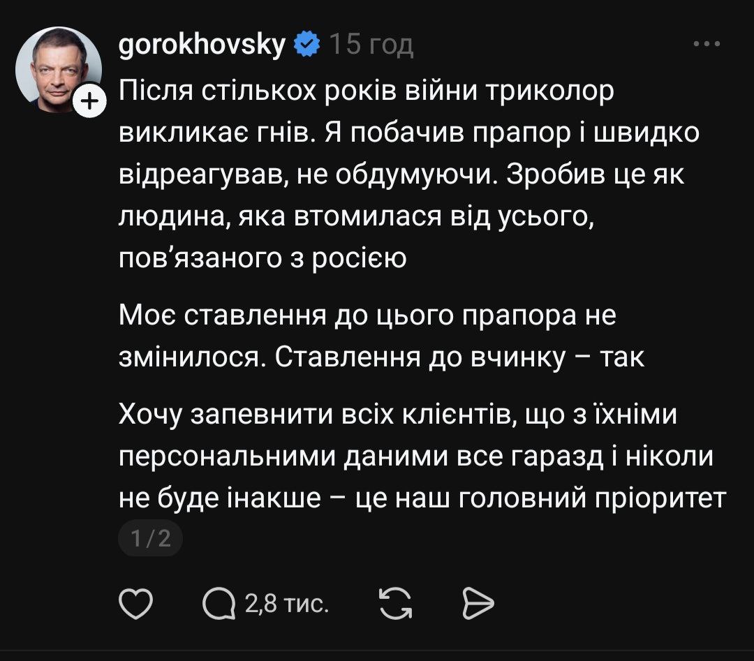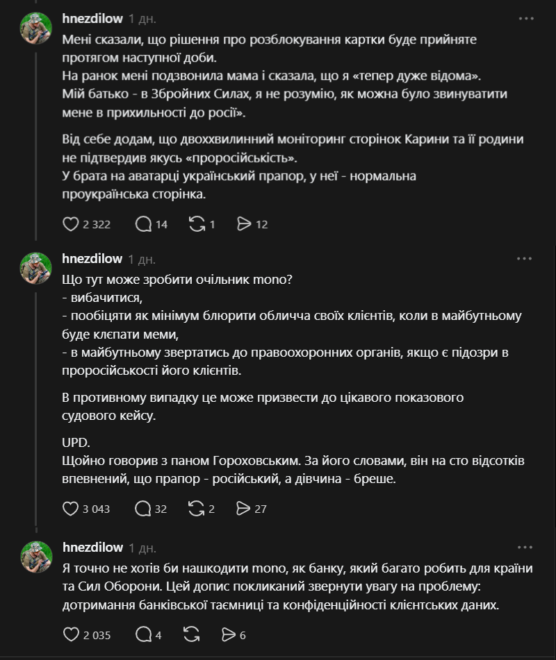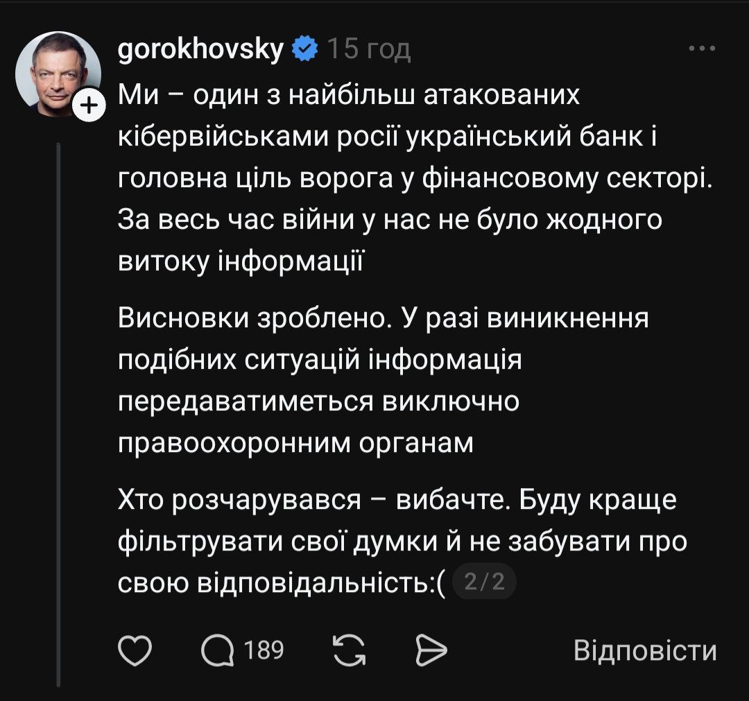 У Threads він закликав Гороховського вибачитися, блюрити обличчя клієнтів і надалі передавати підозри правоохоронцям, а не постити в соцмережі. Підкреслив — претензія не до monobank як банку, який багато робить для ЗСУ, а конкретно до порушення банківської таємниці.