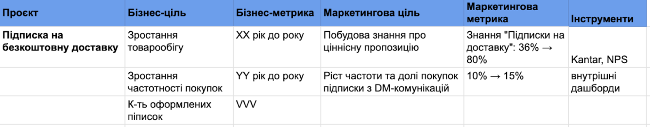 Маркетингових цілей поза бізнесовими не існує. Наші цілі безпосередньо випливають із бізнес-цілей, і кожна має власну метрику. Ось приклад на основі запуску підписки на безкоштовну доставку:
