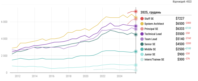 Загалом зарплати розробників залишаються відносно стабільними. Середня зарплата у грудні 2025 року становила $3450 — це на $50 більше, ніж пів року тому.