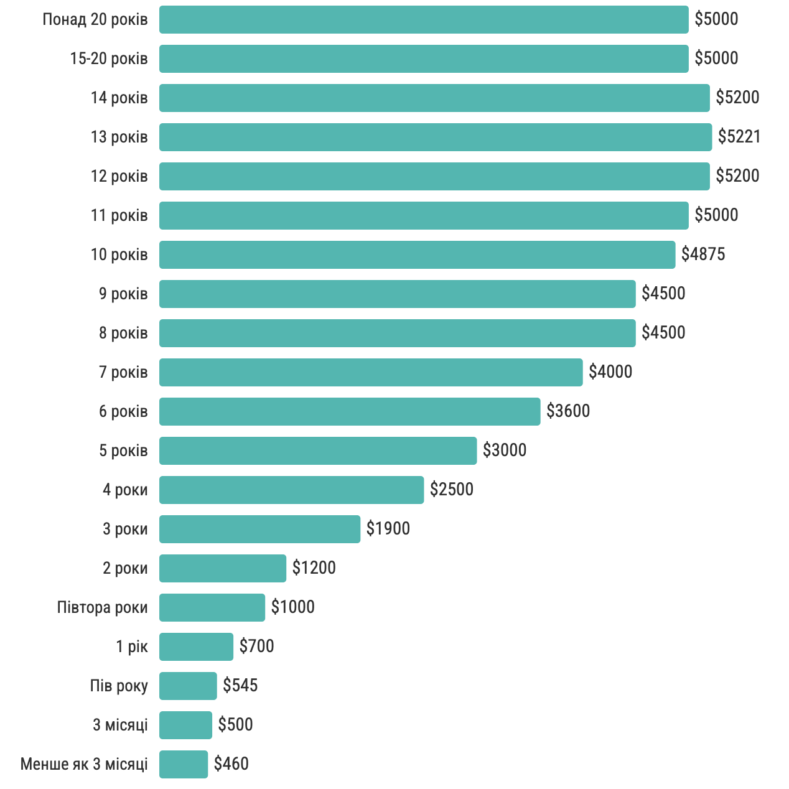 Найвищу медіанну зарплату, як і раніше, мають спеціалісти з досвідом 12-14 років — близько $5200. У фахівців із 15+ роками досвіду медіана залишилася стабільною — $5000.