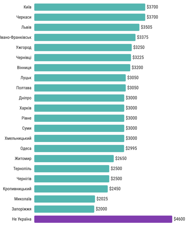 Водночас у низці міст зафіксували суттєве зростання зарплат — зокрема в Черкасах, Ужгороді, Луцьку, Полтаві та Рівному. У великих східних і південних містах (Харків, Дніпро, Одеса) показники залишилися стабільними — близько $3000.