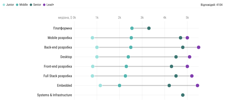 Middle-фахівці мають найвищі зарплати у платформній, Mobile та Back-end-розробці.