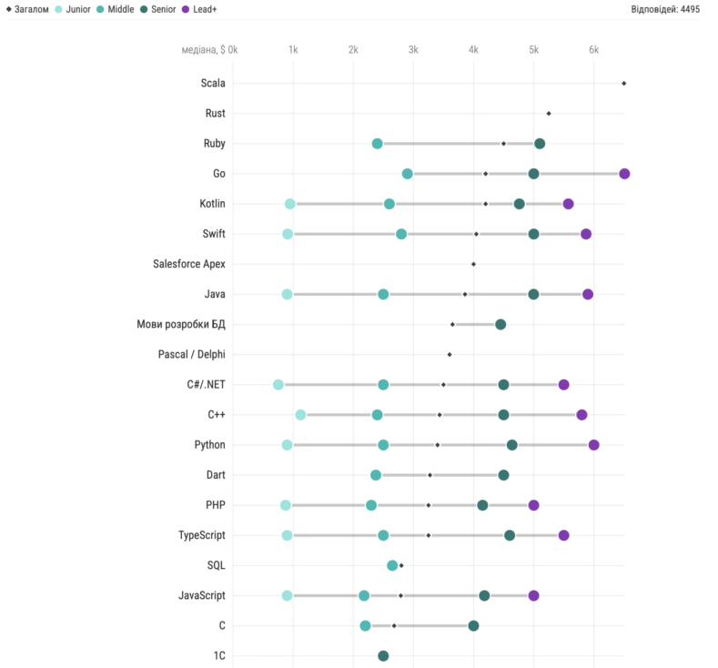 Серед Lead-спеціалістів найвищі зарплати отримують Go-розробники —$6510, а також фахівці, які працюють з Python — $6000, Java — $5900, Swift —$5870 та C++ — $5800.