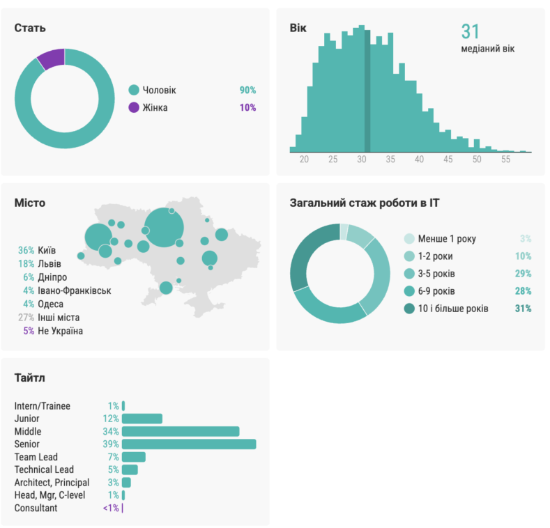 Середній вік розробників зріс до 31 року, частка фахівців із досвідом 10+ років збільшилася, а частка Junior зменшилася на 1%. Найпопулярнішою основною мовою залишається TypeScript, а як додаткові дедалі частіше обирають JavaScript, TypeScript і Python.
